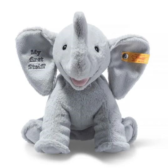 Hello baby! Here comes My First Steiff Ellie elephant – especially soft and gentle on delicate baby skin, absolutely safe and wonderfully fluffy for cuddly snuggling with the very youngest. Ellie elephant radiates a great deal of warmth with her cheerful smile and loving gaze, her large ears invite you to hold and feel her and the cuddly plush ensures a sense of well-being with every touch. With “My First Steiff” embroidery in the ear.